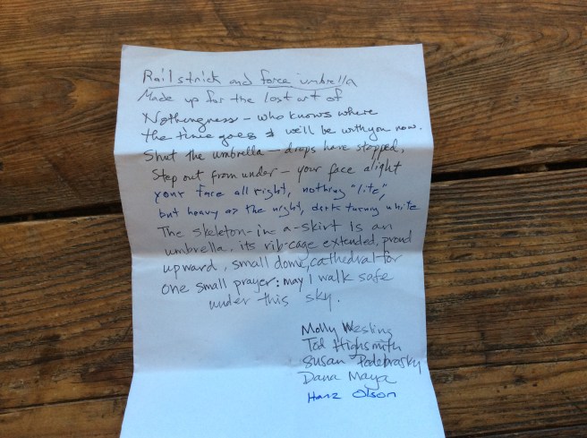 The following is a collaborative poem written at the Spontaneuous Writing Booth during the Share the Word event hosted at the Central Library in Madison, WI on Friday, May 5. I was not one of the spontaneous poets but I gave them the first two lines that propelled the poem to the final 5 lines that Dana Maya graciously contributed.
